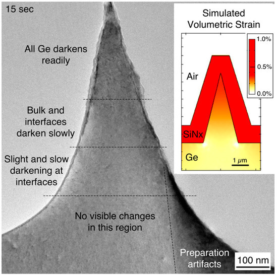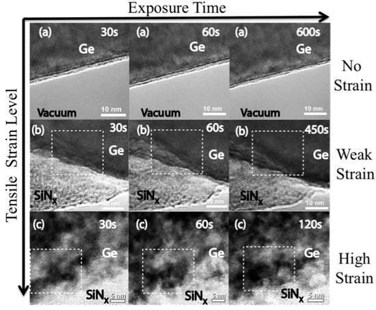 - Qi, M.; O’Brien, W.A.; Stephenson, C.A.; Cao, N.; Thibeault, B.J.; Wistey, M.A. Stability of Tensile-Strained Ge Studied by Transmission Electron Microscopy. In Proceedings of the International Silicon-Germanium Technology and Device Meeting (ISTDM), Berkeley, CA, USA, 4–6 June 2012. [Google Scholar] [CrossRef]