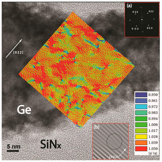 - Jung, D.; Faucher, J.; Mukherjee, S.; Akey, A.; Ironside, D.J.; Cabral, M.; Sang, X.; Lebeau, J.; Bank, S.R.; Buonassisi, T.; et al. Highly tensile-strained Ge/InAlAs nanocomposites. Nat. Commun. 2017, 8, 14204. [Google Scholar] [CrossRef] [PubMed]
