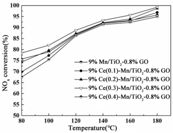 The SCR activities of 9%Ce–Mn/TiO2–0.8%GO with different molar ratios of Ce/Mn at low temperature are shown in Figure 1.