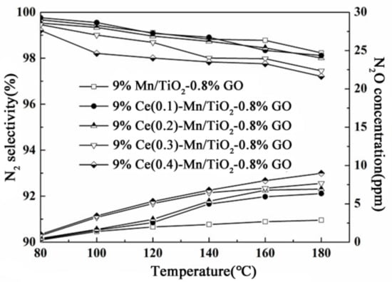 N2 selectivity and N2O formation of the catalysts with the reaction temperature are shown in Figure 2. It can be found that high N2 selectivity (>97%) and a small amount of N2O formation (less than 10 ppm) exists over all of the catalysts. However, the addition of Ce and the increase of temperature had negative effect on the N2 selectivity and N2O formation of the catalysts. With the increase of the reaction temperature, much more NH3, which acted as a reducing agent in the SCR reaction, will be oxidized to generate N2O. As a result, the N2 selectivity of the catalyst decreased with temperature. It has also been proven by Liu et al. that with the increase the ratio of Ce/Mn, much more N2O will be generated. According to the definition of N2 selectivity in Equation (2) mentioned below, the N2 selectivity was decreased []. For practical application, the catalyst with reasonable molar ratios of Ce/Mn (0.3) can be chosen as a candidate for its high SCR activity, N2 selectivity, and trace amount of N2O formation at low temperature.