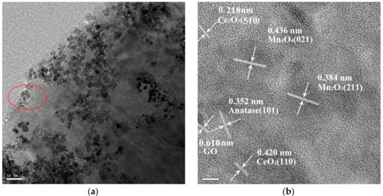 The microstructure of 9%Ce(0.3)–Mn/TiO2–0.8%GO was characterized by TEM and HRTEM, as shown in Figure 4b, respectively. In Figure 4a, the sheet-like morphology of GO can be observed, and the TiO2, MnOx, and CeOx nanoparticles were dispersed randomly on the surface of the GO sheets. Though there was a little aggregation in some area of GO, it was not serious, which may be attributed to the introduction of GO. The corresponding HRTEM image of the catalyst was shown in Figure 4b. The observed spacing between the lattice planes of the catalyst was around 0.218, 0.352, 0.384, 0.420, 0.436, and 0.610 nm, corresponding to the (510) crystallographic planes of Ce2O3, the (101) crystallographic planes of anatase TiO2, the (211) crystallographic planes of Mn2O3, the (110) crystallographic planes of CeO2, the (021) crystallographic planes of Mn3O4, and the (001) crystallographic planes of GO, respectively. The well-distributed status of active components on the surface of the support [] and the coexistence of multivalent metal oxides [] can improve the selective catalytic reduction abilities of the composite catalysts at low temperature.