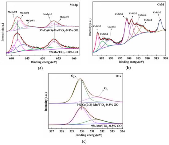 From Figure 5a, it can be found that the Mn 2p3/2 spectra for the 9%Mn/TiO2–0.8%GO and 9%Ce(0.3)–Mn/TiO2–0.8%GO catalysts can both be divided into three characteristic peaks attributed to MnO (640.9 eV), Mn2O3 (642.2 eV), and MnO2 (644.6 eV). However, the bonding energy of the Mn 2p3/2 spectra in 9%Ce(0.3)–Mn/TiO2–0.8%GO showed a slight offset toward the high value, which indicated that the electron transferability could be improved by addition of Ce []. The Mn 2p1/2 spectra of 9%Ce(0.3)–Mn/TiO2–0.8%GO catalyst exhibited two characteristic peaks at 653.0 eV (MnOx/Mn) and 654.1 eV (MnO2), but for the Mn 2p1/2 spectra of the 9%Mn/TiO2–0.8%GO catalyst, there was only one peak corresponding to the existence of non-stoichiometric MnOx/Mn. The contents of Mn with different vacancies in Table 2 were achieved by calculating the percentage of the corresponding peak area. According to Table 2, the content of MnO2 for 9%Ce(0.3)–Mn/TiO2–0.8%GO was higher than that of 9%Mn/TiO2–0.8%GO. This meant the introduction of Ce can increase the content of MnO2 in the catalyst. It has been reported that MnO2 had the highest low-temperature NH3–SCR activity among various manganese oxides []. In addition, from Table 2, it is also shown that, compared with 9%Mn/TiO2–0.8%GO catalyst, 9%Ce(0.3)–Mn/TiO2–0.8%GO nanocomposite had a higher content of the non-stoichiometric MnOx/Mn, which has been demonstrated to be beneficial to the redox reaction of the catalyst and further increase the removal rate of NOx in the SCR reaction []. Thus, with the addition of Ce, the content of MnO2 and non-stoichiometric MnOx/Mn will be increased, which results in the improvement of the catalytic activity of the nanocomposite catalyst [,,].