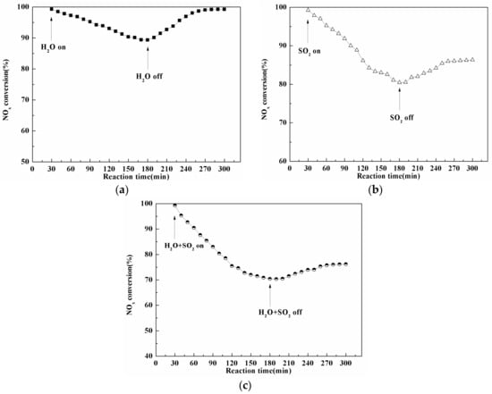 Figure 6a–c show the resistance property of the nanocomposite catalyst to H2O, SO2, and H2O+SO2 at 180 °C. When only 10 vol % H2O was added to the reaction system, the denitrification efficiency decreased from about 99% to 90% with the reaction time. The water in the flue gas may cause serious deactivation of the catalyst because of the competitive adsorption with NH3 on the active sites over the catalyst surface []. However, when the H2O feed was stopped, the NOx conversion of the catalyst nearly completely recovered to the original levels. Due to the presence of hydrophilic groups on the surface of the GO sheets, the water in the flue gas can be absorbed easily, which resulted in the competitive adsorption with NH3. Consequently, the SCR activity of the catalyst decreased obviously with the feeding of H2O.
