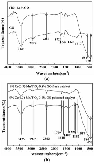 When 10 vol % H2O and 200 ppm SO2 were added together into the SCR system, a much more serious decline in the catalytic activity from 99% to about 70% would occur. This meant there was a synergistic effect of the H2O and SO2 on the activation of the catalyst. When H2O and SO2 were removed from the system, the efficiency recovered to around 78%. In order to identify the mechanism of the deactivation of the catalyst caused by H2O and SO2, the FT–IR spectra of GO and TiO2–0.8%GO support, and the fresh and poisoned 9%Ce(0.3)–Mn/TiO2–0.8%GO catalyst were studied, as shown in Figure 7a,b, respectively.