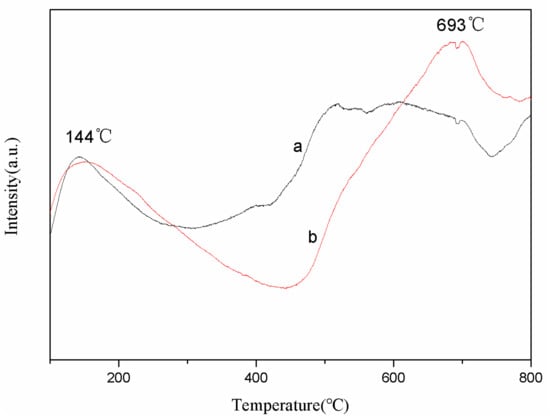 NH3–TPD patterns of 9% Mn/TiO2–0.8%GO (a) and 9% Ce(0.3)×Mn/TiO2–0.8%GO (b).