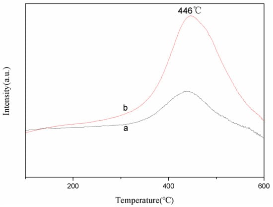 H2-TPR is a valid method to determine the redox performance of the catalyst. Figure 9 shows the TPR curves of the catalysts. It can be found that the H2-TPR pattern of 9% Mn/TiO2–0.8%GO and 9% Ce(0.3)–Mn/TiO2–0.8%GO was similar, where there was a strong peak at about 446 °C. This peak was attributed to reduction from MnO2 to Mn2O3 []. However, it was obvious that the peak area of 9% Ce(0.3)–Mn/TiO2–0.8%GO was much larger than that of 9% Mn/TiO2–0.8%GO, which meant that 9% Ce(0.3)–Mn/TiO2–0.8%GO had larger H2 consumption than that of 9% Mn/TiO2–0.8%GO. Thus, it was demonstrated that 9% Ce(0.3)–Mn/TiO2–0.8%GO had better redox performance than 9% Mn/TiO2–0.8%GO, which was very important for the SCR reaction.