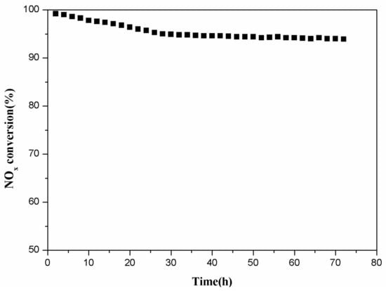 Stability test of 9% Ce(0.3)–Mn/TiO2–0.8%GO catalyst within 72 h.