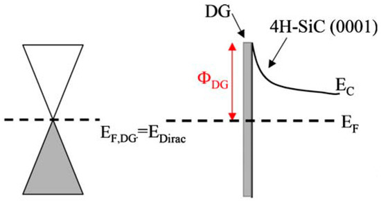 Energy band diagram of the graphene Schottky contact to silicon carbide (4H-SiC) [9]. To exclude the buffer layer effect on Schottky barrier formation, the authors used the graphene exfoliated from highly oriented pyrolytic graphite and deposited on 4H-SiC. DG denotes the deposited graphene on the SiC substrate, without the buffer layer [15]. EC represents the energy of the conduction band edge; EF is the Fermi energy for the bulk 4H-SiC; EF,DG is the Fermi energy of exfoliated graphene, which was directly deposited on the SiC surface. ΦDG is the Schottky barrier height. EDirac corresponds to the Dirac point energy. Due to the absence of the buffer layer (only weak van der Waals-like interaction between DG and the Si substrate occurs), EF,gr corresponds to the Dirac point energy. Reprinted from Sonde et al. [15]. Copyright (2009) with permission from The American Physical Society.