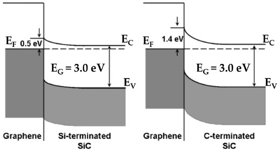 In the case of epitaxial graphene films on the Si-face of SiC substrates, a carbon-rich buffer layer with partial sp3 hybridization is always formed [46]. As mentioned above, the buffer layer substantially affects the electronic properties of graphene and causes pinning of the Fermi level and the subsequent reduction of the Schottky barrier height (Figure 5). In particular, it was shown that in the absence of the buffer layer, the barrier height is 0.85 ± 0.06 eV (buffer-free deposited graphene/4H-SiC) [15] and 0.75 ± 0.05 eV (buffer-free hydrogen-intercalated graphene/4H-SiC) [45], whereas the structure comprising a buffer layer exhibits a significantly reduced barrier height of 0.36 ± 0.1 eV (epitaxial graphene/4H-SiC) [15] and 0.55 ± 0.05 eV (epitaxial graphene/4H-SiC) [45].