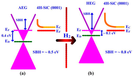 In the third case of the absence of a buffer layer, after exposure to intercalants, we consider how hydrogen intercalation effects the electrical properties of the vertical graphene/SiC structure. As has been reported by Dharmaraj et al. [45], the vertical structure composed of as-grown epitaxial graphene and the Si-face SiC substrate exhibits a rectifying behavior with large leakage current under reverse bias (the Schottky barrier height in this case is approximately equal to 0.55 ± 0.05 eV). The authors ascribed this quite low value of the Schottky barrier height to the enhanced density of unsaturated silicon bonds in the vicinity of the interface. For correctness, the covalently bound C atoms should be also taken into account. Due to these reasons, Fermi level pinning induced by charge transfer occurs. The band diagram presented in Figure 4a clearly demonstrates that both the presence of silicon dangling bonds and the buffer layer leads to strong n-type doping of graphene and, as a consequence, an increase of the work function and reduction of the Schottky barrier height. During hydrogen intercalation, hydrogen species simultaneously saturate the silicon dangling bonds and break partially the covalent bonds between the buffer layer and the Si-terminated surface of SiC, thereby decoupling the buffer layer. As a result of the removal of the buffer layer and the partial saturation of unsaturated Si bonds, the hydrogen-intercalated epitaxial graphene/SiC structure demonstrates improved rectifying behavior with low leakage current in the reverse bias regime (the Schottky barrier height after intercalation procedure was estimated to be 0.75 ± 0.05 eV). As can be seen from Figure 4b, an increase in the value of the Schottky barrier height can be explained by Fermi level depinning induced by the reduction of the density of the unsaturated Si bonds and n-type doping of graphene. A complete passivation of the Si-terminated surface may lead to a change in the conductivity type of graphene. The change from n-type to p-type results in the modification of the band bending from upward bending to downward bending, and thus, the electrical properties of the graphene/SiC structure can be also modified.