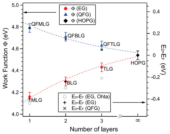 Dependence of the work function of epitaxial graphene (EG) with the buffer layer (red symbols) and buffer-free quasi-free-standing graphene (blue symbols) on the number of layers [48]. Abbreviation of QFG means quasi-free-standing graphene. The black symbols correspond to the position of the Dirac point with respect to the Fermi level for epitaxial graphene and quasi-free standing graphene. Reprinted from Mammadov et al. [48]. Copyright (2017) with permission from Institute of Physics Publishing Ltd. HOPG, highly-oriented pyrolytic graphite.