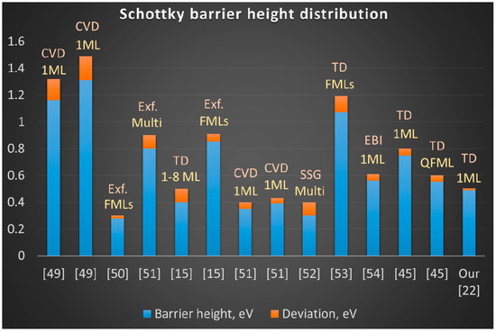 As can be seen from this histogram, the Schottky barrier height at the graphene/SiC heterointerface is strongly sensitive to the growth method and the graphene thickness. Furthermore, as was reported earlier, the unintentional presence of unavoidable natural ripples and ridges in epitaxial graphene on SiC may also cause the fluctuations in the Schottky barrier height [49,50,51,52,53,54]. The key factors influencing the uniformity of the Schottky barrier height for graphene/SiC structures are the homogeneity of the graphene thickness, the quality of the grown interface (defects, pits, dislocations, surface roughness), the kind of grown interface (SiC polytypism, face polarity) and the growth conditions. We found that the Schottky junctions formed by the high-temperature Si sublimation approach [55] exhibit the smallest standard deviation of the mean value of the Schottky barrier height. This can be explained by the fact that the graphenization process via thermal decomposition of SiC promotes the formation of large-scale homogeneous epitaxial graphene layers [56,57,58,59].