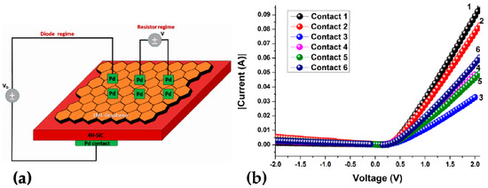 (a) Sketch of the graphene/4H-SiC vertical device and (b) current-voltage characteristics of the vertical graphene-4H-SiC device. The y-axis indicates the absolute values of current. Palladium contacts (1–6) are positioned at different places on the graphene surface [22]. Reprinted from Shtepliuk et al. [22]. Copyright (2016) Shtepliuk et al.; licensee Beilstein-Institut.