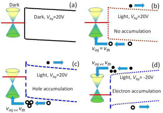 Band diagram of graphene/SiC interface (a) in dark and (b–d) under illumination. No electrostatic doping in graphene is observed in dark conditions. Vg is the voltage applied to the gate; Vinj is velocity of carrier injection from the SiC into the graphene; and Vth is the carrier’s thermal velocity, respectively. Graphene becomes n-type after applying forward bias in the “light” regime (c) and p-type after applying a reverse bias in the light “regime” (d) [60]. Reprinted from Butt et al. [60]. Copyright (2015) with permission from IEEE.
