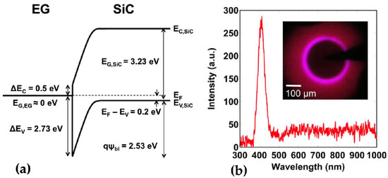 Indeed, Andersson et al. [23] found that the I-V characteristics across the n-type epitaxial graphene/p-SiC interface are better described by a p-n diode model than by thermionic emission. According to this theory, the carrier transport mechanism through the anisotype graphene/silicon carbide p-n junction is governed by diffusion and recombination of carriers in the quasi-neutral region. In order to confirm the applicability of the theory, electroluminescence studies were performed, allowing one to obtain a direct proof of the radiative recombination in the silicon carbide layers. If a forward or reverse-biasing voltage is applied across the p-n junction, a visible emission at the edges of the graphene mesa is observed, as shown in the in Figure 11b. The observed peak at 410 nm (3.02 eV) is associated with an optical radiative transition between the acceptor level and the conduction band in SiC. This proves the injection of minority carriers in silicon carbide from the graphene side. In principle, the injection of minority carriers is also possible in the case of a Schottky diode, but the injection ratio is negligible because of the low carrier density in the SiC [62]. Therefore, these experimental observations are more likely associated with the formation of a heterojunction than a Schottky barrier. It is assumed that in this case, an anisotype (p-n) transition type 1 is formed, with a dominant current due to recombination and diffusion in the forward bias regime and reverse bias leakage caused by thermal generation. The band diagram of the system being studied is shown in the Figure 11a.