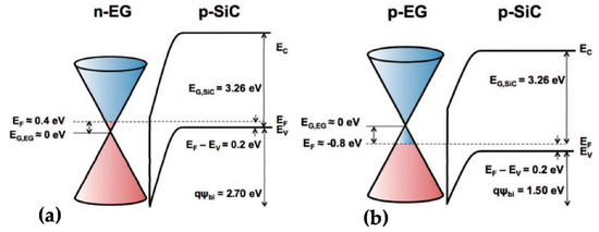 In another work, Anderson et al. [61] have performed a comparative analysis of the electrical properties of the anisotype p-n junction (n-type epitaxial graphene/p-type SiC) and isotype p-p junction (p-type epitaxial graphene/p-type SiC) in the dark and light regimes. Band diagrams for these devices are shown in Figure 12.
