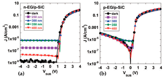 Dependences of the current-voltage characteristics on the illumination wavelength for different devices: n-type epitaxial graphene/p-type SiC (a) and p-type epitaxial graphene/p-type SiC (b) junctions [61]. Reprinted from Anderson et al. [61]. Copyright (2015) with permission from The Japan Society of Applied Physics.