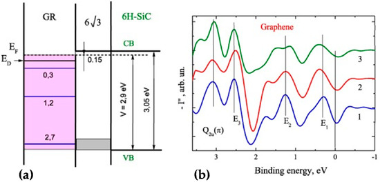 Interestingly, some authors reported that bound quantum states may occur at the graphene/n-type SiC heterointerface [24]. This phenomenon is probably due to the formation of deep (2.9 eV) and narrow (2.15 Å) barriers, the so-called layered nanostructure with the hole quantum well (QW) potential relief (Figure 14a illustrates the band diagram of the investigated structure). The authors emphasized that the carbon-rich buffer layer with surface reconstruction (6√3 × 6√3) R30° plays the role of the wide band-gap layer, since the chemical interaction between the interfacial layer and SiC diminishes the π-electronic subsystem and opens a gap. According to the literature data, such an energy gap can reach ~2 eV for the (6√3 × 6√3) R30° layer [63]. Due to these features, the top of the graphene valence band (shaded area in Figure 14a) looks like a hole quantum well, and the quantum confinement of the electrons normal to graphene plane is expected. As can been seen from Figure 14b, three distinguished peaks near the Fermi level at energies of E1 = 0.3 eV, E2 = 1.2 eV and E3 = 2.6 eV are present on the valence band density of states. These singularities were attributed to the quantum well bound states. Taking into account the fact that these peaks are absent on the valence band spectra of graphite and SiC substrate, they have a graphene-like nature. In addition, the authors reasonably assumed that the observed valence band features (E1, E2 and E3) cannot be assigned to the buffer layer because previous studies showed that the (6√3 × 6√3) R30° buffer layer is only responsible for the appearance of two additional peaks g1 and g2 at binding energies of 0.5 and 1.6 eV [1,64], which do not coincide with the E1, E2 and E3 peaks.