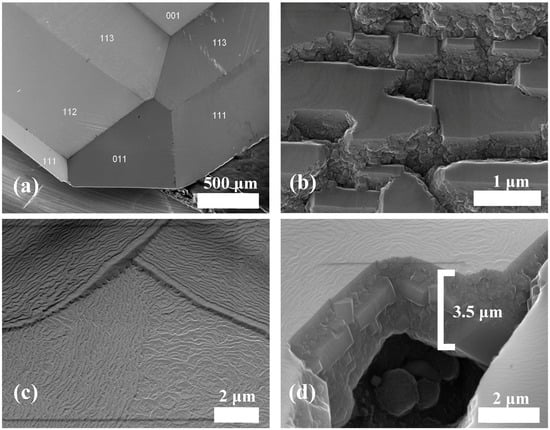 Figure 1d demonstrates the growth lacunae on the face {100}, on which one can measure the thickness of a homoepitaxial film grown in 5 min. This thickness of 3.5 μm corresponds to the growth rate of 42 μm/h for the {100} face. Without the addition of N2, the epitaxial growth rate at 4% CH4 and 800 °C of about 5 μm/h was reported for the {100} face [23]. In other words, the addition of 4% of N2 to the gas mixture increases the growth rate by an order of magnitude, in agreement with other publications [7,15].