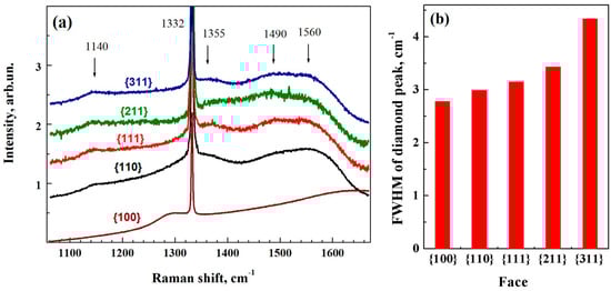 The width of the diamond peak in the Raman spectrum increases in the series {100} → {110} → {111} → {211} → {311} from 2.7 to 4.3 cm−1 (Figure 2b). The diamond 1332 cm−1 peak broadens as a result of defects presence, and also due to a nonuniform stress. The peak shift is caused by a stress, tensile or compressive, depending on the shift sign. From the diamond Raman peak shift ΔνR, we estimated the stress σ in the film according to relationship σ [GPa] = ΔνR [0.38 GPa/cm−1] for hydrostatic stress [24], the positive or negative values of σ corresponding to compressive or tensile strength, respectively. For the {100} and {211} faces, the position of this peak corresponds to unstressed diamond. For the {111} and {110} faces, the shift of the diamond peak corresponds to the compressive stress of 0.15 GPa, while, for the {311} face the tensile stress of 0.3–0.6 GPa is assessed. The ratio of summed intensities of the TPA and G bands to the area of the diamond peak increases in the series {100} → {211} → {111} ≈ {110} → {311} according to the increase of the fraction of non-diamond phase in the film.