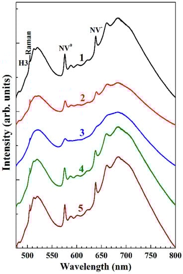 Figure 4 displays the PL spectra taken at on {100} face on a hillock shown in Figure 5a, along the line A-B across the hillock, from foot to the top and further. The spectra are normalized to the integral intensity of the diamond band at 505 nm in the Raman spectrum. The PL spectra show three optical centers with zero phonon lines (ZPL) at wavelengths of 575 nm (NV0 defect), 637 nm (NV– defect), and 503 nm (H3 defect). The optical centers at 575 and 637 nm are formed by defects containing one nitrogen atom and one vacancy in neutral and negative charge states, respectively [25]. The NV defects are usually detected in CVD diamond films grown with the addition of nitrogen. However, the H3 optical center, formed by the 2NV0 defect, two nitrogen atoms and a vacancy in a neutral charge state, is less common in CVD diamond, because during growth nitrogen atoms are introduced into the crystal lattice one by one, not in pairs. In HPHT diamonds, the enhanced concentration of H3 centers is observed in less-stressed regions of the crystal and near dislocations [33].