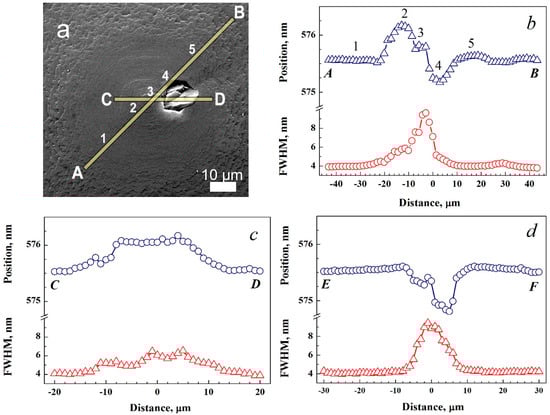 Owing to the presence of a vacancy, the NV optical centers are characterized by high values of strain softening, a mechanical stress leads to a significant shift in the position of its ZPL [25]. We measured the position and the FWHM of ZPLs at 575 nm and 637 nm across two hillocks. One of them contained a non-epitaxial polycrystalline aggregate on the top (Figure 5a), while the second hillock (not shown here) had no such polycrystalline inclusion. The PL spectra were measured in 1 µm or 1.4 µm steps along the lines A-B (Figure 5b) and C-D (Figure 5c), respectively, crossing the hillock near the top. The PL mapping of the second hillock was performed along the line E-F (Figure 5d), again crossing its top. The Lorentz profiles were used for fitting ZPL in the PL spectra.