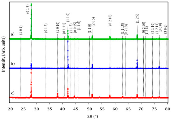 Figure 1 shows the XRD patterns collected on ground ribbons, as well as on the surface in contact with the copper wheel and the free surface. The patterns show that the ribbons are well crystallized regardless of the sample considered. No significant peak broadening is observed suggesting that the grain size is above the nanoscale range. All of the reflections for the ground ribbons and free surface can be indexed with the standard polycrystalline pattern of Bi0.48Sb1.52Te3 indicating the absence of impurity phases. If the patterns of those samples are quite similar, that of the contact surface clearly exhibits a significant degree of texturing along the (110), (015) and (125) planes, indicating an orientation effect during the material’s solidification. The trigonal axis of the crystallites orientated along these three directions forms an angle of 90°, 58°45′ and 77°4′ respectively, with the normal of the free surface as shown in Figure 2. As the XRD pattern of the free surface is similar to that of ground ribbons, the level of texturing should be limited to a region close to the contact surface. Our results are however quite different from those obtained by Koukarenko et al. [46], who studied in detail the texture formation in Bi2Te3 ribbons. Their investigation revealed a well-defined (025) texture independent of the quenching temperature, the ribbon thickness and the heat treatment. This (025) texture was proposed to be correlated to the nature of the Bi-Te covalent bond in this plane. Further investigations on the Bi2−xSbxTe3 (0 ≤ x ≤ 1) system by the same authors showed that substituting Sb for Bi tends to lessen the (025) texture and favors the appearance of the (110) texture [48]. The difference between the textures observed in [46] and in our case could be linked to different cooling rates since the thickness of the ribbons obtained in their studies was significantly higher (between 20 and 35 µm).