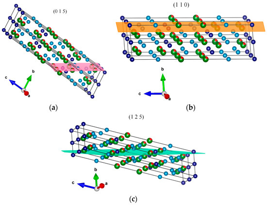 Scheme of the most pronounced orientations depending on the surface of the melt-spun ribbons probed: (a) free surface (015) planes; (b) wheel contact surface (110) planes; (c) wheel contact surface (125) planes. The Bi, Sb, Te1 and Te2 atoms are shown in red, green, dark blue and light blue, respectively. The two-colored atoms correspond to the mixed occupation of Bi and Sb with the ratios of 24% and 76%, respectively.