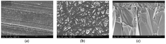 The obtained microstructures observed by SEM are similar to those observed in prior studies on similar or close compositions (Figure 3) [37,38,39,43,58]. Typically, top views of the contact surface do not demonstrate any specific microstructural details except those related to the wheel roughness (Figure 3a), while top views of the free surface exhibit what Xie et al. [37,38,39,43] called a dendritic-like microstructure (or a needle network microstructure, as termed by Koukarenko et al. [46,48]) of 0.1–0.5 µm in width (Figure 3b). Cross-section views of the ribbons, shown in Figure 3c, indicate a close-packed microstructure of about some hundreds of nanometers in thickness in the region close to the contact surface, which is composed of a mixture of small-sized particles up to one micrometer in size and possibly of nanosized particles as expected from the MS process. This structure is followed by a columnar growth of the basal planes giving rise to a dendritic or a needle-like appearance of the free surface. According to the XRD results, preferential growth occurs in the thin close-packed microstructure, while an erratic growth takes place in the columnar structure.