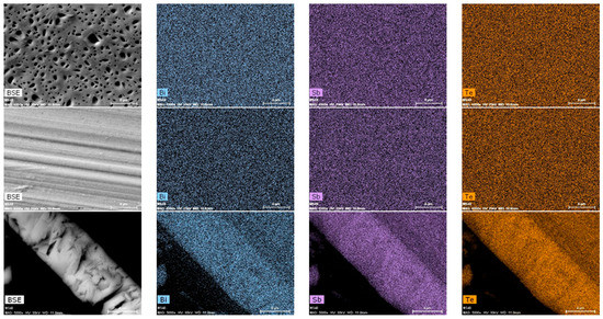 Backscattered electron (BSE) images and corresponding X-ray elemental mappings of: (top line) the free surface; (middle line) the contact surface; and (bottom line) the cross-section of a Bi0.48Sb1.52Te3 ribbon.