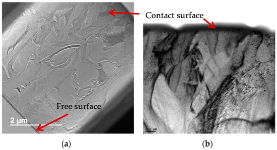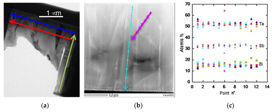 TEM and HRTEM studies have been carried out to gain relevant insights into the nanostructure of the ribbons. We address in particular the issues concerning the formation of amorphous zones during the MS process, the presence of which has not been systematically observed in prior studies, and the possible precipitation of elemental Te as observed in single-crystals grown in out-of-equilibrium conditions. A top view obtained by TEM of one of the thin cross-section slices produced by FIB is shown in Figure 5a. Similar features to SEM observations can be seen, that is a close-packed microstructure close to the contact surface of less than 1 μm in thickness followed by a columnar growth. The thickness of the columnar grains is less than 1 μm. The surface close to the wheel is composed of grains of about 100 nm (Figure 5b). In this analyzed section, neither an amorphous, nor a nano-sized zone could be observed. This observation contrasts with the results obtained by Xie et al. [39,42], who found the presence of an amorphous layer of about 500 nm in thickness for an overall thickness of about 3 mm (assuming that the authors showed the entire cross-section). The presence of nanoparticles embedded in an amorphous matrix (thickness of about 1 mm as shown in [39]) could not be observed either. The reasons for these discrepancies remain so far unknown.