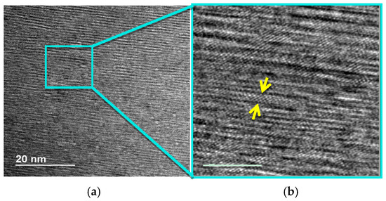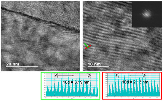 TEM images also reveal lattice stripes with a larger estimated width of about 10 Å (Figure 9). A magnification of this zone shows that these stripes are formed by a series of five bright-doted rows separated by a more dark-spotted row. This result is consistent with the five-layer lamellae structure of the ideal crystal structure of Sb-Bi tellurides. The above-mentioned width is also in very good agreement with the height of the -Te-Bi-Te-Bi-Te- quintet (12 Å according to [61]). These features are not inherent to the MS process we employed and have also been reported by Lan et al. [62] and Li et al. [63] in p-type BixSb2−xTe3 samples prepared by two synthetic routes consisting of mechanical alloying-SPS and mechanical alloying-hot pressing, respectively. In these two studies, however, the appearance of these stripes was slightly different and was described as a series of two rows of extra-bright dots separated by four weaker bright-dot rows forming the five-layer lamellae.
