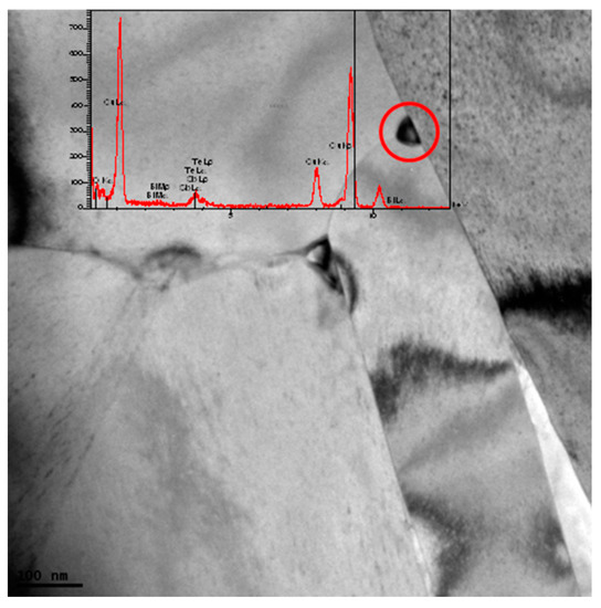 Figure 6 displays two HRTEM images collected in the middle zone of a ribbon. The first image was taken at the interface between two grains, while the second image was taken in the center of a grain. Based on the fast Fourier transform (FFT), the grains are well crystallized, and the average inter-fringe distances d taken along the lines in the main and perpendicular directions (0.319 and 0.213 nm, respectively) are in good agreement with the inter-planar distances of the (015) (0.317 nm) and (110) (0.215 nm) planes [59]. These measurements further confirm the orientations found in our XRD analyses. Interestingly, some nano-sized particles of elemental Te could be also observed at grain boundaries as illustrated in Figure 7.