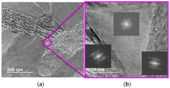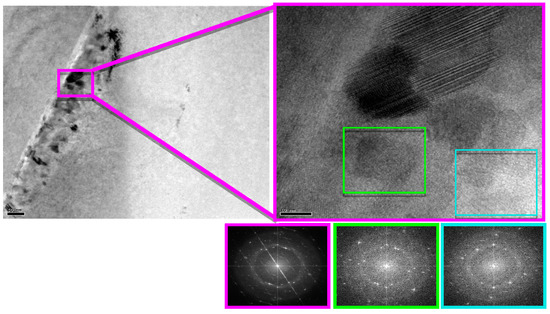 Figure 8 shows a grain boundary between four adjacent grains in the dendritic-like zone obtained from an SEM-FIB thin slice cut parallel to the free surface. The triangular-shaped feature of about 70 nm on the side and located in between larger grains is typical of growth with the trigonal axis perpendicular to the surface evidenced by the hexagonal disposition of the spots obtained on the FFT of this zone. Some of these triangular-shaped structures that exhibit clean surfaces with the surrounding crystals can be observed all over the thin slice. The tops of the two columnar grains surrounding the triangular crystal are single crystalline. Both grains display an interplanar distance of 0.117 nm that corresponds to the (205) planes. Such sub-micron-sized crystalline domains were systematically observed in prior investigations on MS ribbons of BixSb2−xTe3 [37,38,39,42,60].