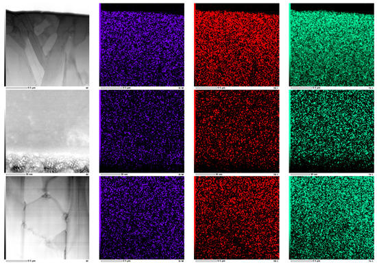 The chemical composition of the ribbons was further analyzed by EDXS using the STEM mode along five profiles on two ribbons as depicted in Figure 11. The compositions seem independent of the region probed, the data taken along a columnar grain (green and sky blue lines) and in the dendritic zone (dark blue and red lines) being roughly similar. X-ray elemental mappings were performed in several zones of one ribbon, that is in the dendritic zone, at the interface of the amorphous-crystallized grains and within a hexagonal grain (Figure 12). The elemental distribution shows that the elements are evenly distributed in the dendrites, the columnar structures and the amorphous layer, without any particular compositional segregation.