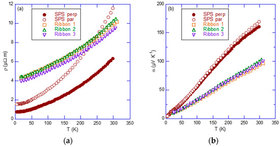 Temperature dependence of the electrical resistivity ρ (a) and thermopower α (b) for the bulk sample consolidated by spark plasma sintering (SPS) probed along and perpendicular to the pressing direction and for three randomly-selected ribbons.
