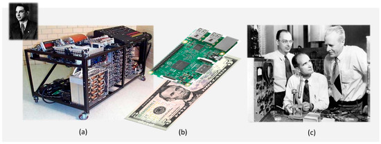 (a) Prof. J. Atanasoff (Iowa State College, 1938) and the replica of ABC (Museum of Computer History, Mountain View CA) [1]; (b) Raspberry Pi—a credit-card-size computer on the background of its cost—a five dollar bill (Cambridge UK, 2012) [2]; (c) J. Bardeen, W. Shockley and W. Brattain—inventors of the first semiconductor transistor (Bell Labs, 1947) [3].
