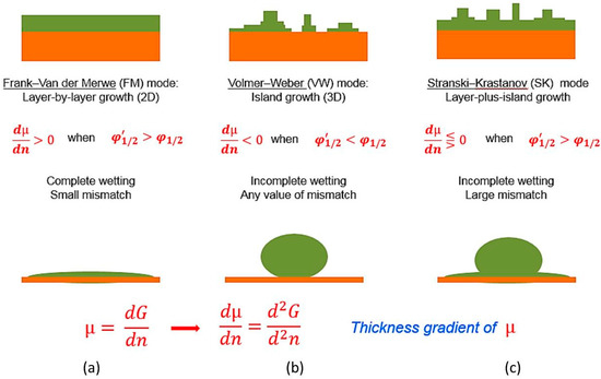 In the case of heteroepitaxy, i.e., when a crystal material (marked with a “prim”) grows on another, substrate material, there are two possibilities: (i) when , then the gradient of the chemical potential in the growth direction is positive, i.e., and the growth of the “prim” material, being energetically favored, will result in a smooth 2D-type surface morphology (Figure 2a); and (ii) when and , then the growth will be rather 3D-type island growth (Figure 2b).