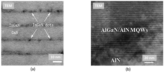 Transmission electron microscopy (TEM) images of: (a) InGaN quantum dots [9] formed within a GaN structure and (b) AlGaN/AlN quantum wells [10], both within an AlN structure. (Reproduced from [9,10] with the permission of AIP Publishing).