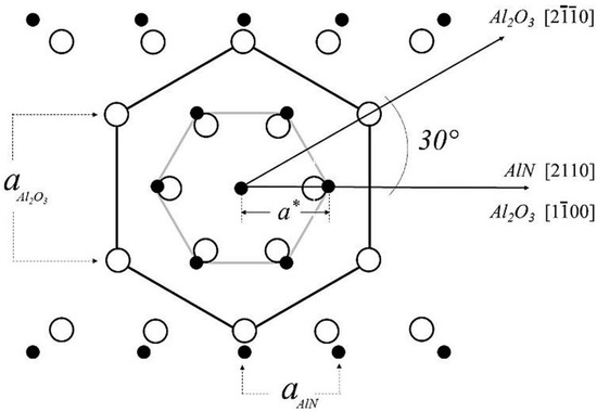 Top view of the epitaxial relationship between AlN (0001) and sapphire (0001) with 30° rotation with respect to each other. The distance marked as “a” is the separation between O2− atoms in sapphire [14]. (Reproduced from [14] with some modifications).