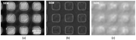 Scanning electron microscopy (SEM) images of: (a) the patterned by e-beam lithography sapphire surface covered with ordered metallic aluminum mesas. The average sizes of the square mesas are 400 nm × 400 nm × 100 nm; (b) the pattern after low temperature annealing—the islands have converted into polycrystalline Al2O3; and (c) the pattern after the solid state crystalline conversion [19]. (Reproduced from [19] with the permission of J. Mat. Res.).