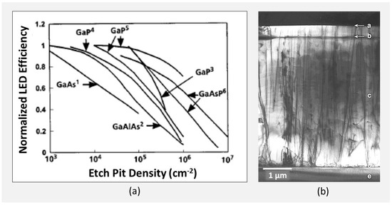 The development of semiconductor light sources and, particularly, of Light Emitter Diodes (LED) is an indivisible part of our World which is directly related to clean environment and energy conversion. Involving more and more wideband semiconductor materials made it possible to produce high intensity sources that radiate in red, yellow, and green. However, blue was missing for years from the LED spectrum and, from here, the white as a mixture of red, green, and blue. Because of their wideband structure, everybody was waiting for improvements in the III-Nitride growth technologies. In the case of GaAs, GaP and other related traditional III-V semiconductor materials, the efficiency of a LED is strongly dependent on the dislocation density in the material [23] (Figure 6a). Based on this experience, it looked almost impossible that GaN, due to its high dislocation density—sometimes ~2.1010/cm2 [24], but definitely always >107/cm2—could be used in making efficient optoelectronic devices (Figure 6b).
