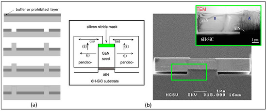 (a) Different stages of an Epitaxial Lateral Overgrowth (ELO) growth—the front of crystallization may change or not its direction; (b) PENDEO epitaxy: the presence of a buffer layer is not necessary; in both cases blocking the vertical growth on the ridges may be purposely done by the deposition of a layer that prohibits the growth [31]. (Reproduced from [31] with the permission of J. Cryst. Growth).