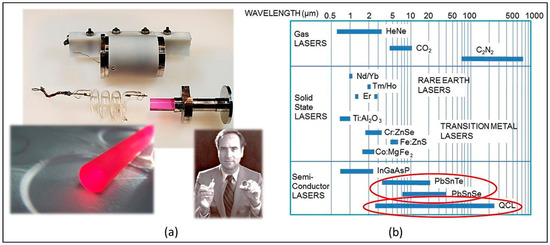 (a) Theodore Maiman with the first Ruby laser demonstrated in 1960 at the Hughes Research Labs [37]; (b) Some of the available direct laser sources in the IR and THz region [38].