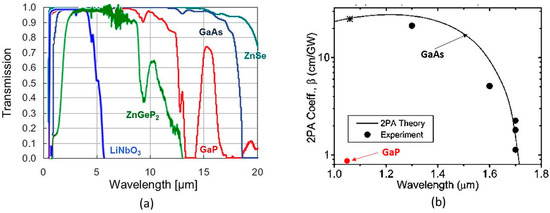 Converting the frequency of an available pump laser into a new wavelength of interest was initially realized in bulk nonlinear birefringent crystals such as AgGaSe2, ZnGeP2 [39], and KTP. However, some problems with the birefringent crystals such as thermal lensing, low damage threshold and beam walk-off turned the attention to compensating the phase velocity dispersion by QPM. QPM circumvents the constraint of birefringence, allowing the nonlinear material to be engineered to produce any wavelength within the transparency range of the given material, and to take advantage of the largest element of the nonlinear susceptibility tensor . Engineering of a material means to make it to consist of a periodical structure with areas with alternating opposite crystallographic orientations in which the sign of the second order nonlinear susceptibility is opposite. The first practical realization of such a patterned structure was in ferroelectric periodically-poled LiNbO3 (PPLN). Strong intrinsic absorption in this material, however, limits the use of PPLN to wavelengths shorter than 4 μm [40] (Figure 9a). In non-ferroelectric materials, where it is not possible to pattern the material through electrical field poling, QPM can be achieved by spatially inverting the nonlinear susceptibility during growth. Initially this was done through alternating the orientation of wafers in a stack [41]. However, high optical losses, observed at the wafer interfaces, and the small layer thickness that is needed to satisfy the QPM conditions made these approaches unsuitable for practical devices. The attempts to grow a thick layer on the edge of the stack, using the edge surface as a patterned template, solved the first issue, but not the second one. Advances in planar technology adopted from the microelectronic industry made possible the practical realization of thin micro-structured materials, called orientation-patterned (OP) templates, with the necessary domain reversal for QPM interaction. The last remaining step for making a QPM structure is to grow on the thin OP template a layer from the same material which is thick enough for a bulk frequency conversion device—maintaining the periodic orientation of the initial template pattern is, of course, a strict requirement. GaAs with its broad IR transparency (Figure 9a), high nonlinear optical susceptibility, and mature growth technology has been highly successful as an OP nonlinear material [42,43]. However, OPGaAs is not without limitations, too, as the most unpleasant among all of them is, probably, its strong two-photon absorption (2PA) at wavelengths below 1.7 µm [44]. This disadvantage cannot be neglected, because the range 1–1.7 µm is heavily populated with mature readily available commercial laser sources based on Nd, Yb, and Er that could be otherwise used for pumping the GaAs QPM structure. In contrast, compared to GaAs, the same structured GaP has a negligible 2PA coefficient in the same spectral range (Figure 9b).