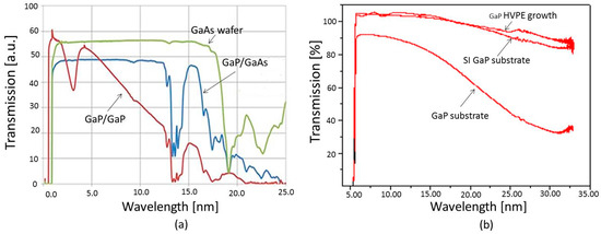 (a) The additional absorption band between 2–4 µm in GaP substrates (red line) does not exist in GaAs (green line) and is reduced in the Halide Vapor Phase Epitaxy (HVPE) heteroepitaxially grown GaP deposited on GaAs; (b) the HVPE grown material is as transparent in the IR as the commercial p-doped SI GaP [59]. (Reproduced from [59] with the permission of OSA).