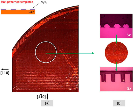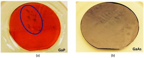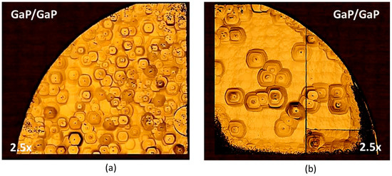 Nomarski microscope top layer surfaces of GaP grown on plain “on-axis” (100) GaP (a) and (100) GaAs (b) substrates. The samples are quarters of 2-inch wafers. The images are taken using stitching software at 2.5× magnification [59]. (Reproduced from [59] with the permission of OSA).