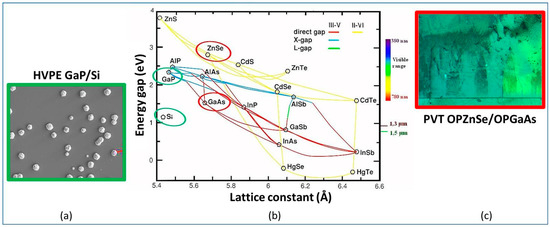 (a) HVPE growth of GaP directly on Si; (b) Bandgap energy vs lattice constant for some of the most popular semiconductor materials (Reproduced from [65] with some modifications); (c) Physical vapor transport growth of OPZnSe on a OPGaAs template [64]. (Reproduced from [64] with the permission of J. Cryst. Growth).