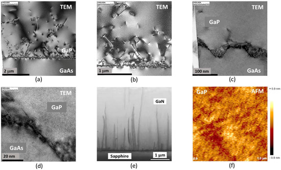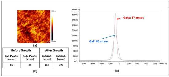 Surprisingly, from the first experiments the GaP/GaAs heteroepitaxy resulted in the same smooth surface morphology in comparison to the surface morphology after GaP/GaP homoepitaxy, with the same typical growth features for a 2D and an average surface roughness (rms) within 1 nm in 1 µm × 1 µm square Atomic-force microscopy (AFM) images (Figure 14a). The crystalline quality, expressed by the Full Width of Half Maximum (FWHM) of an omega-scan reflection signal was also comparable for both GaP/GaP and GaP/GaAs cases (Figure 14b), although the initial crystalline quality of the GaAs substrate (before growth) was higher (Figure 14b,c).