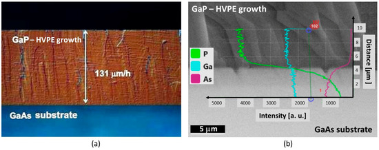 (a) Cross section of HVPE heteroepitaxy of GaP on GaAs substrates; (b) Elemental profile analysis across the interface between the GaAs substrate and the grown GaP layer [59]. (Reproduced from [59] with the permission of OSA).